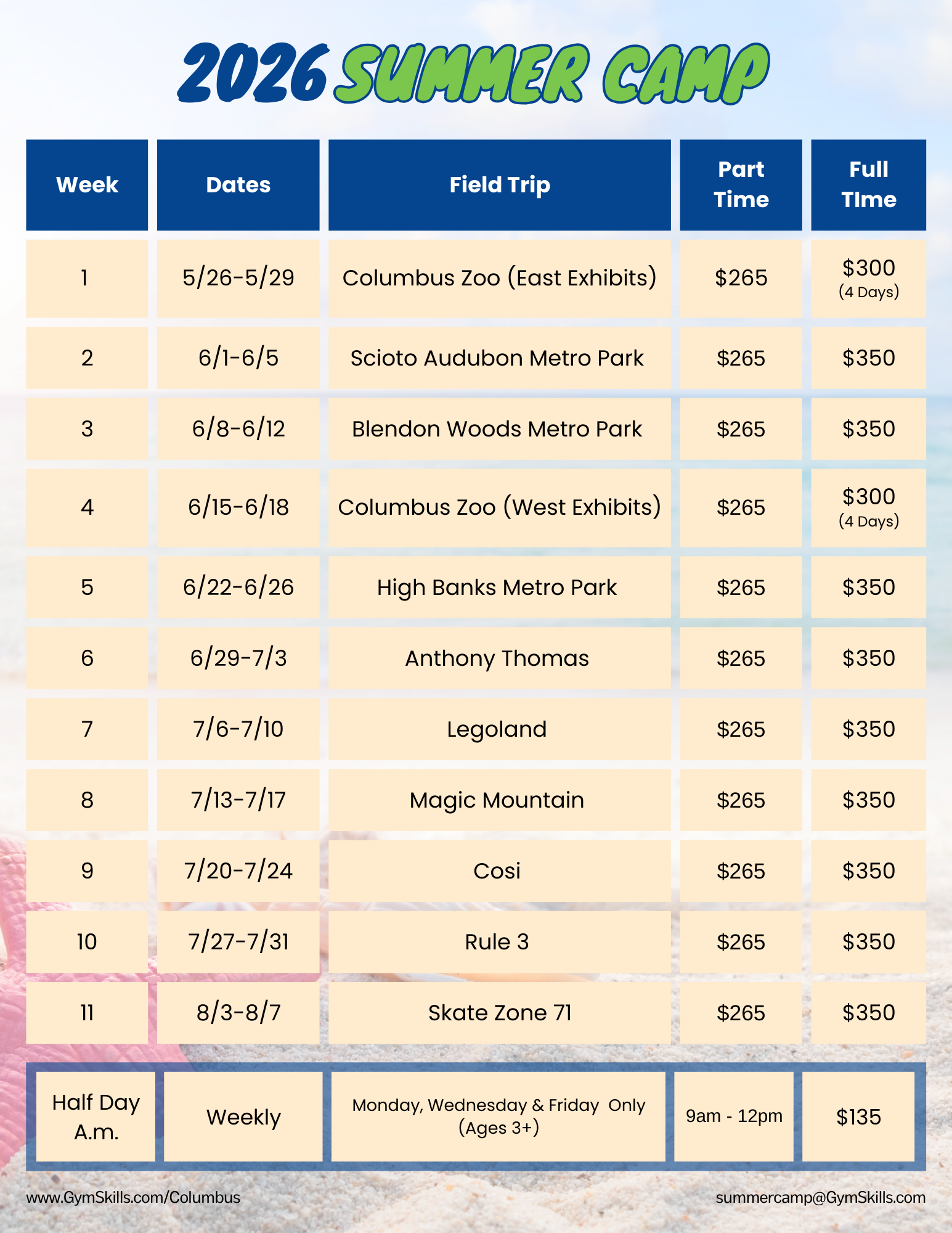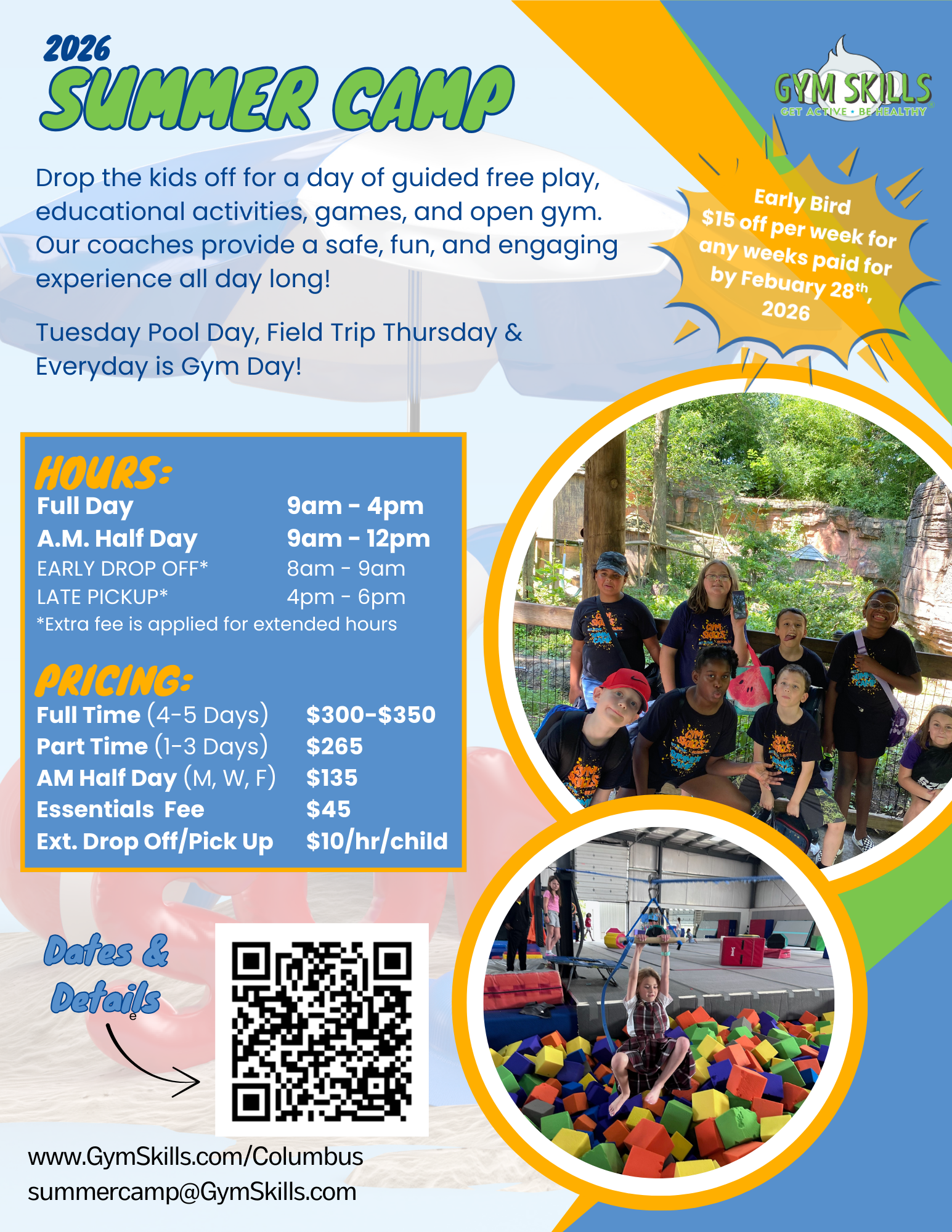 In the case of having to miss your scheduled camp week due to an extenuating circumstance please contact summercamp@gymskills.com.