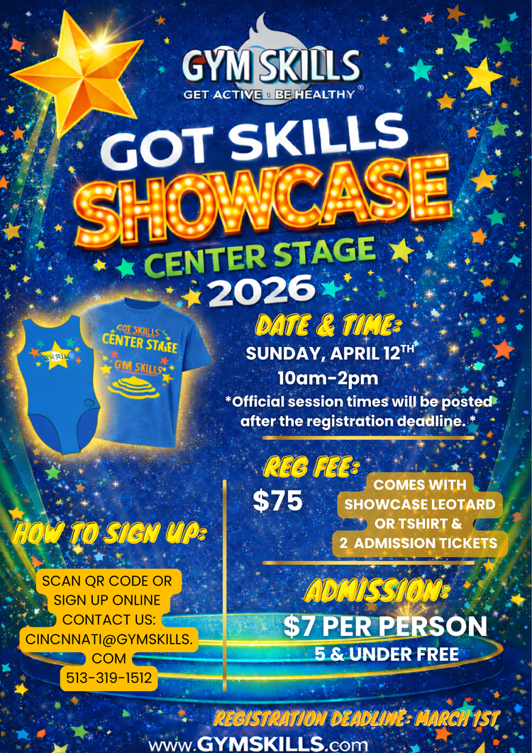 We are thrilled to introduce our 2026 Got Skills Showcase: Center Stage, a special event created exclusively for our recreational athletes to shine! This exciting, non-competitive showcase celebrates confidence, progress, and the hard work athletes put into their classes throughout the year.